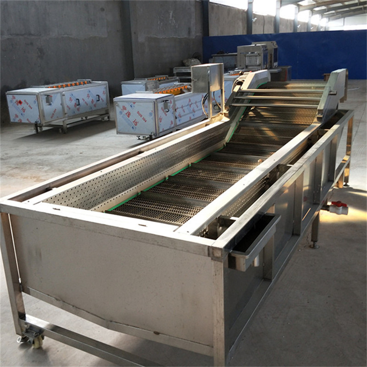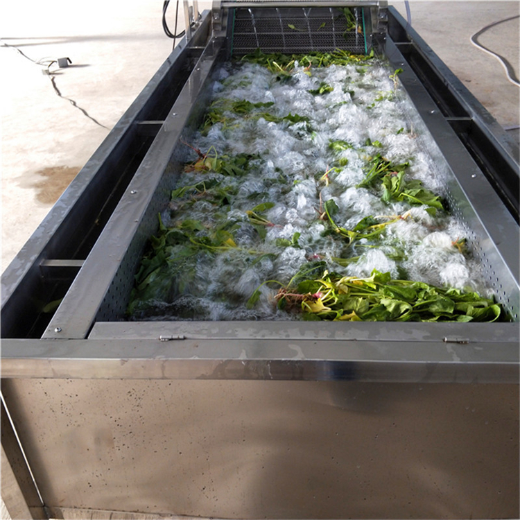 蔬菜清洗機設備中均由SUS304材料制作而成,基本符合出口食品衛生要求。清洗設備中設有氣泡發生裝置,使物料呈翻滾狀態,去除產品表面農殘的功效。漂浮物可以從溢流槽溢出,沉淀物從排污口排出,以達到清洗的目的。該清洗機械設備在氣泡、沖浪、提升、噴淋等聯合工作下,具有洗潔凈高、節能、節水、設備穩定可靠能保持原有色澤等特點。是蔬菜、食品加工、餐飲等行業的理想設備。