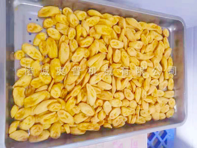 原料→篩選→清洗→切片(切段)→殺青→瀝水→速凍→解凍→真空浸漬→清洗→瀝水→真空油炸→真空脫油→調味→產品包裝→入庫。